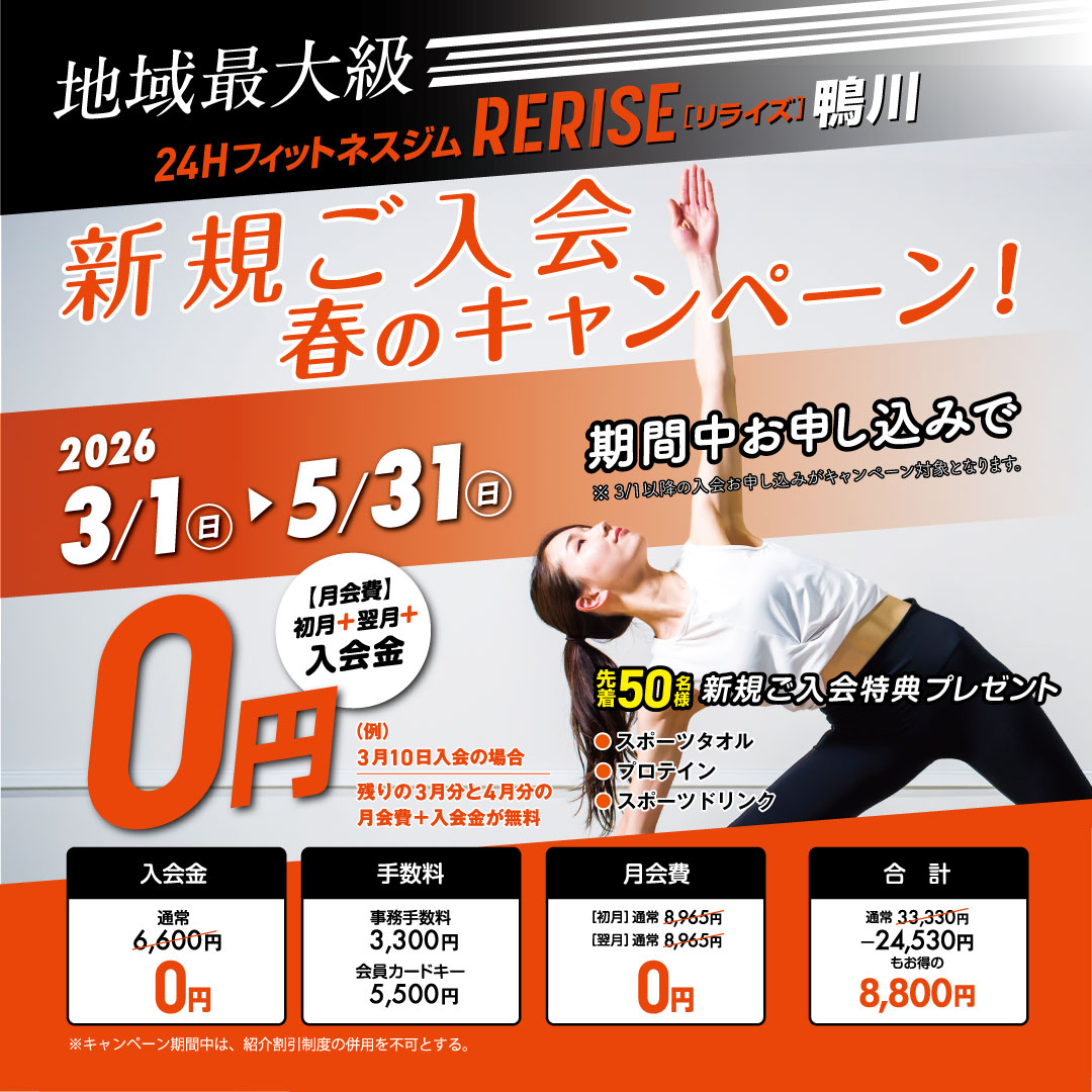 \春の新規入会キャンペーンスタート🌸/ 【 3/1~5/31限定】 なんと… 🔶入会金 🔶初月会費 🔶翌月会費 👉 ぜんぶ 0円。 合計 24,530円分 お得。 さらに 先着50名様限定で 🎁スポーツタオル 🎁プロテイン 🎁スポーツドリンク プレゼント 「今年こそ身体を変えたい」 「夏までに間に合わせたい」 「運動を習慣にしたい」 始めるなら、 今が一番お得です。 見学・体験も受付中。 お電話でお気軽にお問い合わせください。 ※キャンペーン期間中の割引併用は不可となります。 ※在籍の縛りはございません。